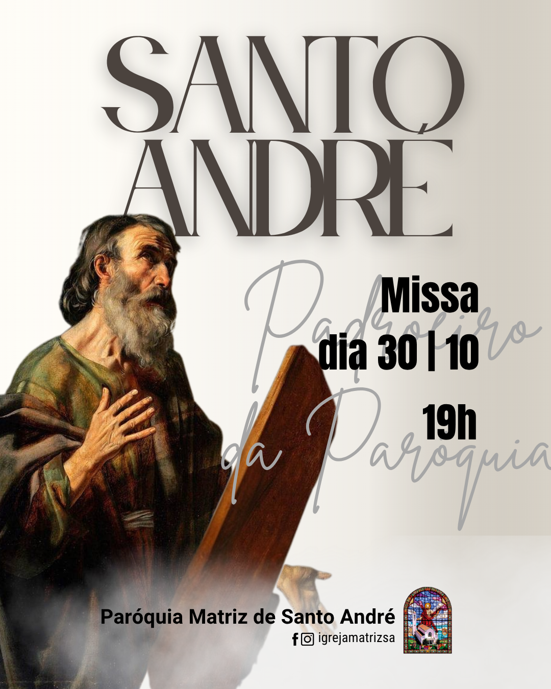 No dia 30 de outubro, às 19h, a Paróquia Matriz de Santo André convida você e sua família para a Santa Missa em homenagem a Santo André Apóstolo, patrono de nossa igreja e de nossa cidade. Ao final, teremos a Benção com o Santíssimo Sacramento — momento de profunda fé e comunhão.