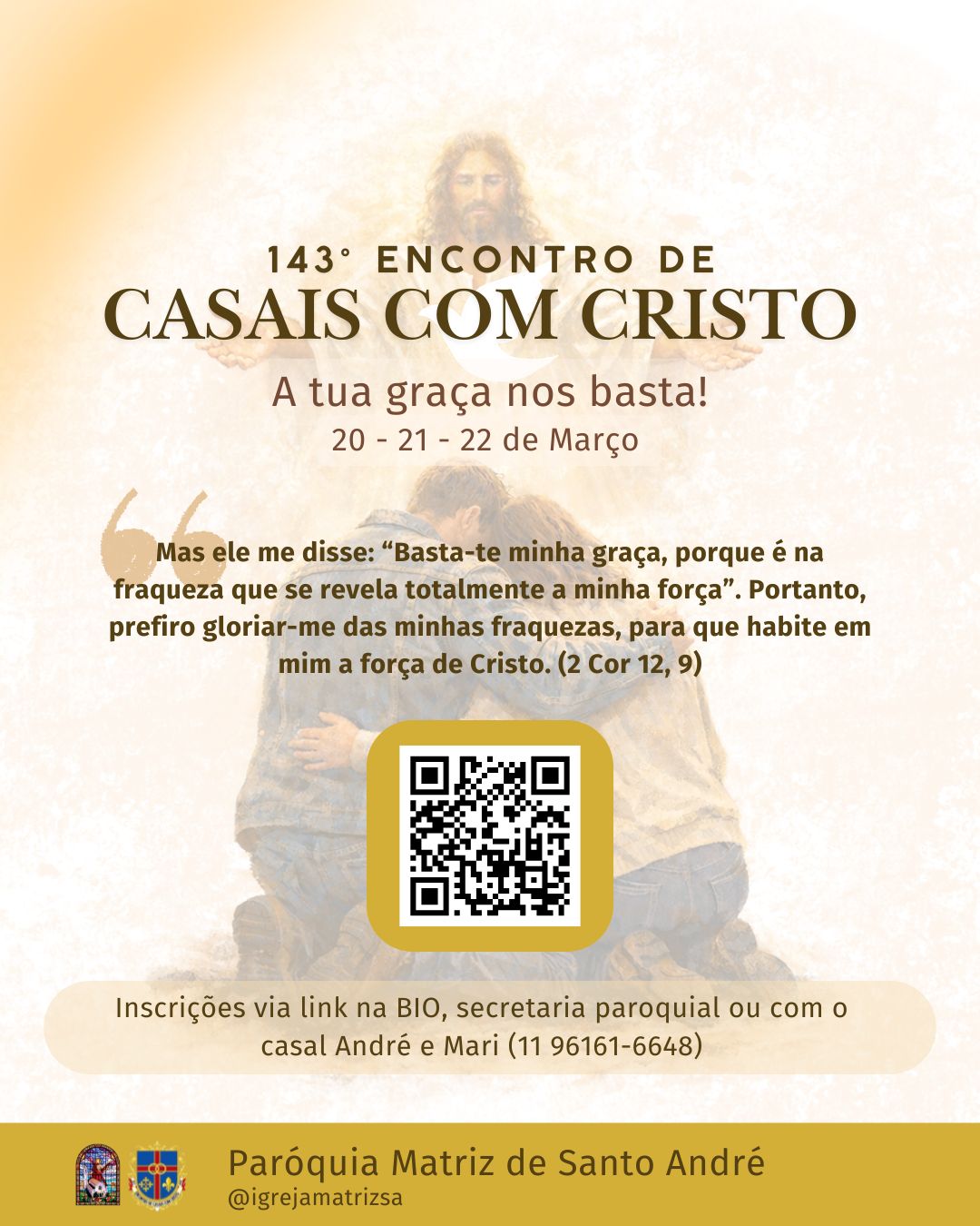 👉 Inscrições abertas na secretaria paroquial, ou com o casal André e Mari pelo 11 96161-6648 ou ainda pelo link: https://forms.gle/P7o7WHsNQDkLGHEz5 - Vagas limitadas.